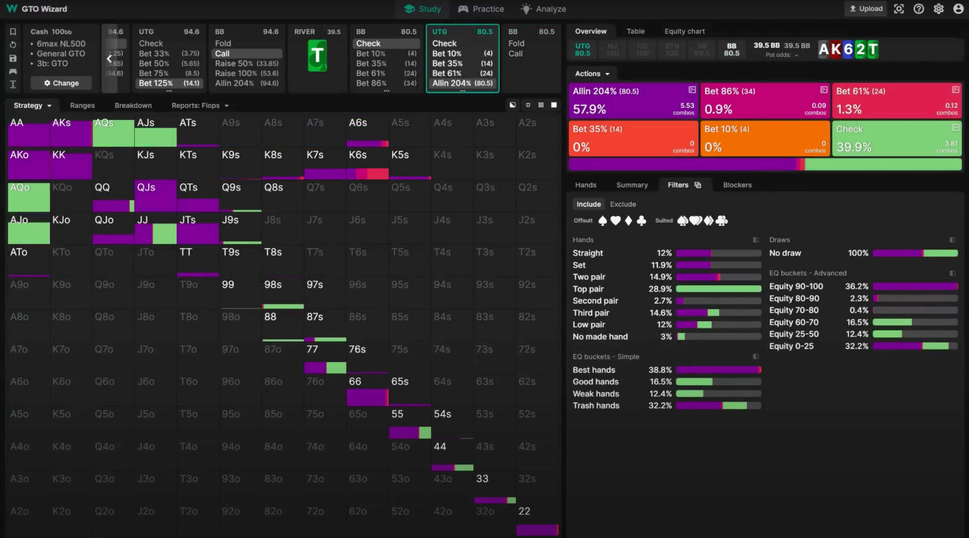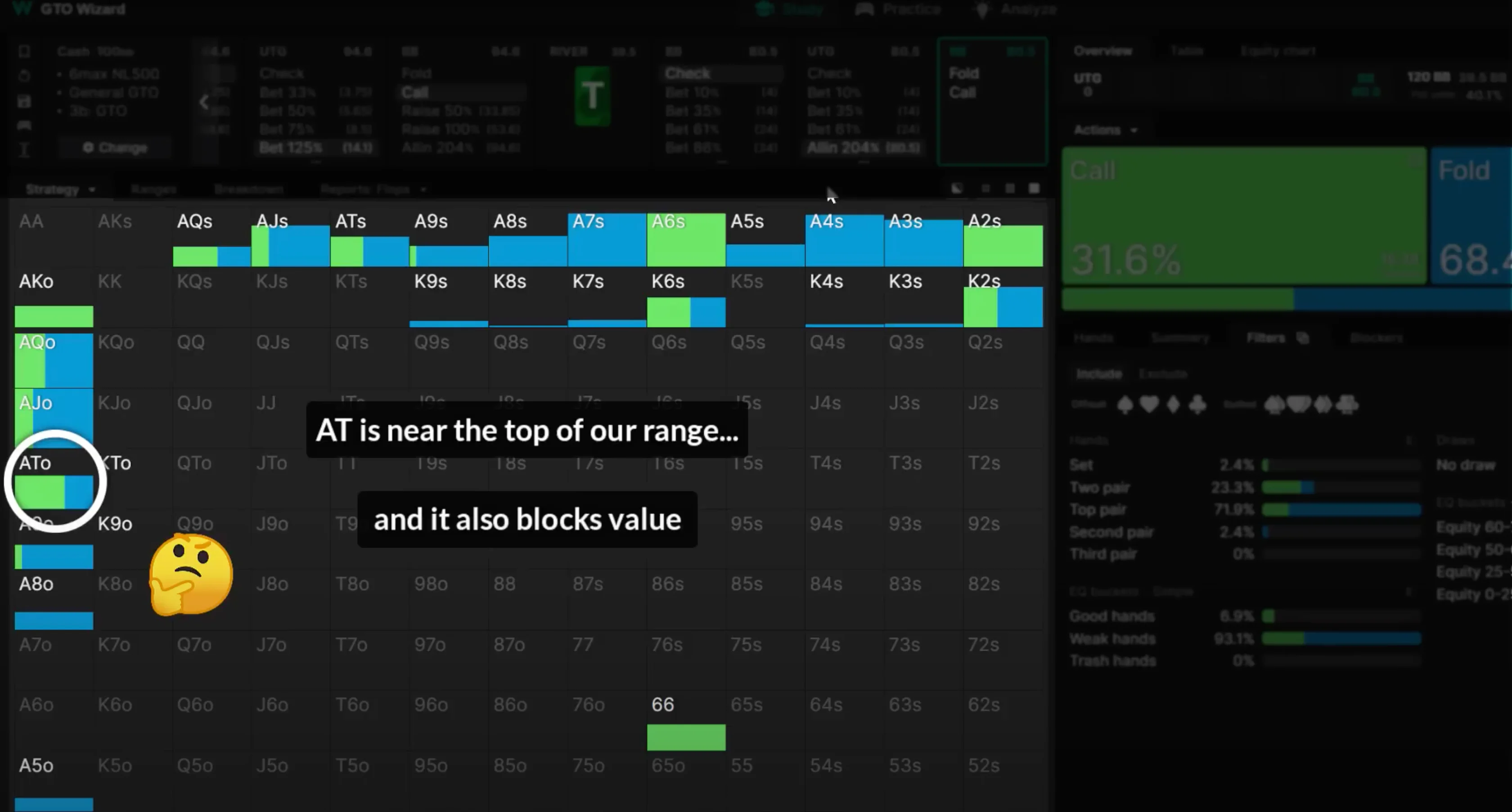 Here’s how NOT to use the solver — we input the hand, and look at what AT does facing a jam. The solver is calling most of the time, so we conclude that calling is the right decision. Maybe we even think about why the solver is calling: here AT is one of the strongest hands we can have, and we even block some of UTG’s value.