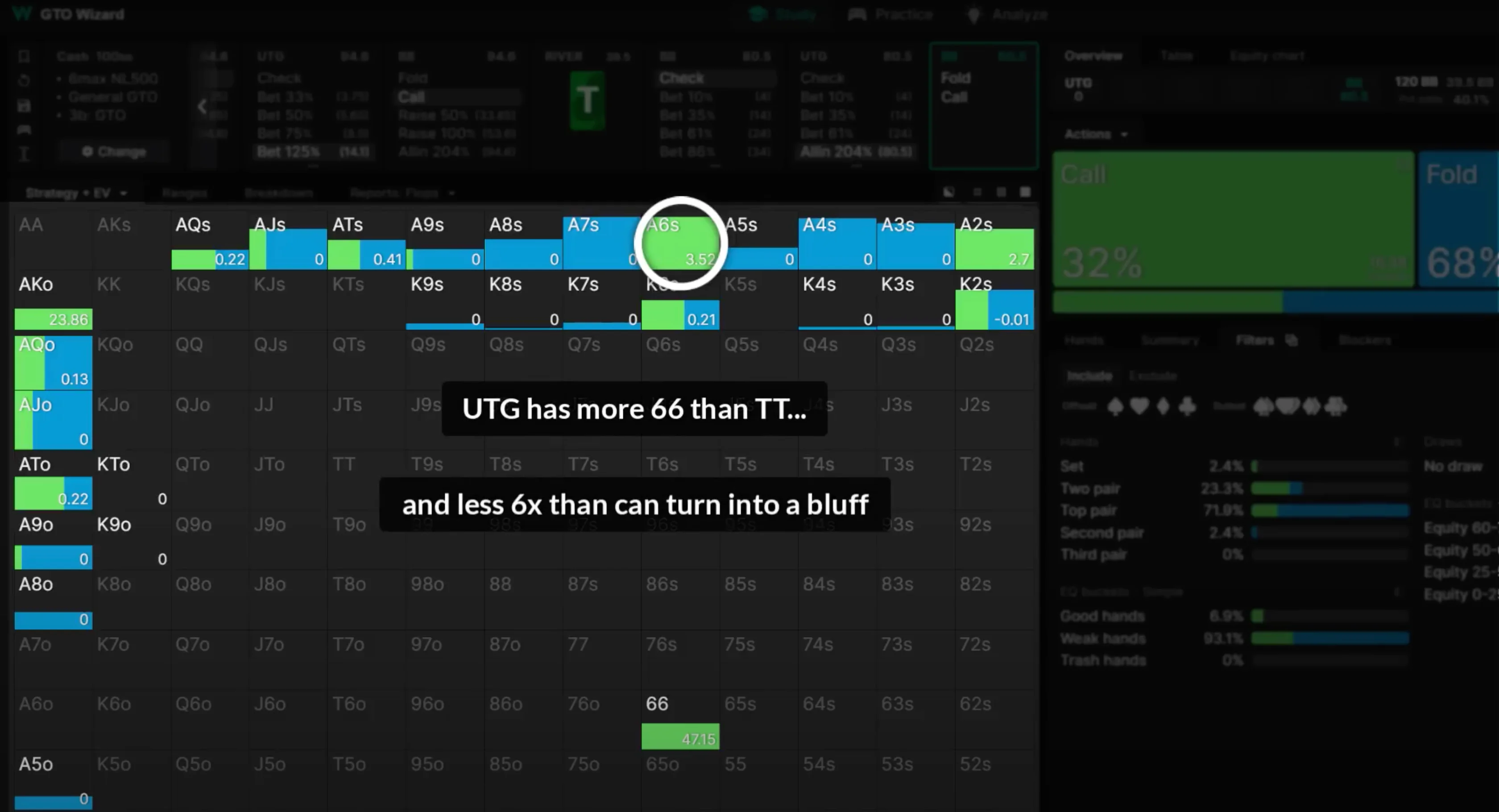 Instead, here’s how a good player would use the solver: they input the hand, and notice that AT is indifferent when facing a jam. They understand that indifferent hands are very sensitive to villain’s mistakes, and that it’s necessary to look at UTG’s side of the strategy, in order to better understand how an actual player might be deviating.