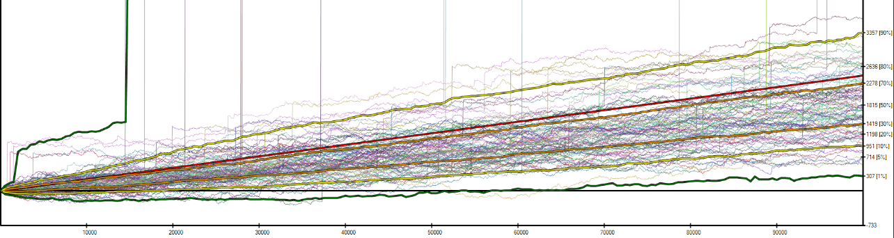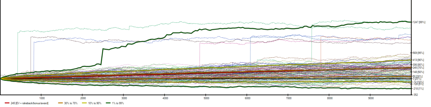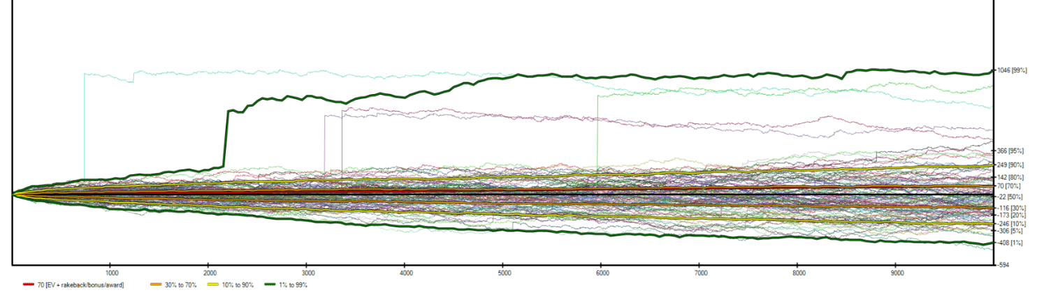 If we revisit the previous example in SwongSim simulation (25 CEV and 25% RB) but extend the simulations to 100,000 games — a volume achievable in a year — then we notice that we become positive in all possible outcomes.