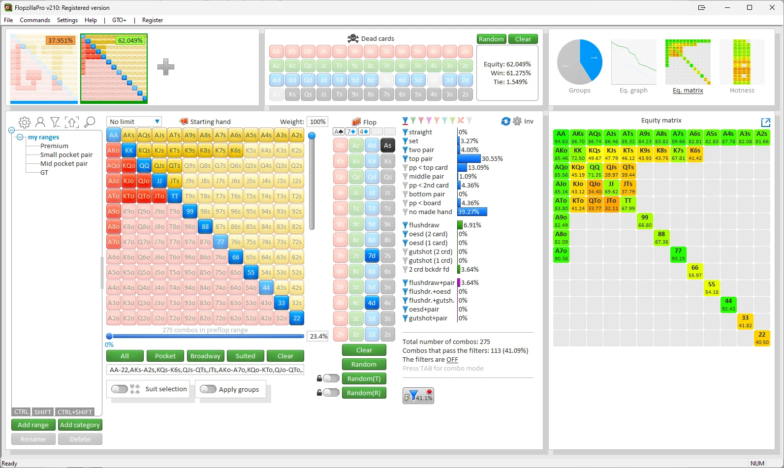 The first step after launching the software is to specify the desired list of pocket cards on preflop. The next step is to select a board — Flopzilla automatically displays how often the specified pocket cards help to form a winning combination on a particular table.