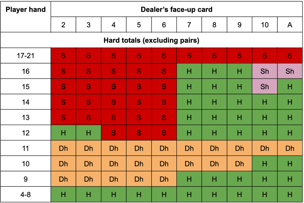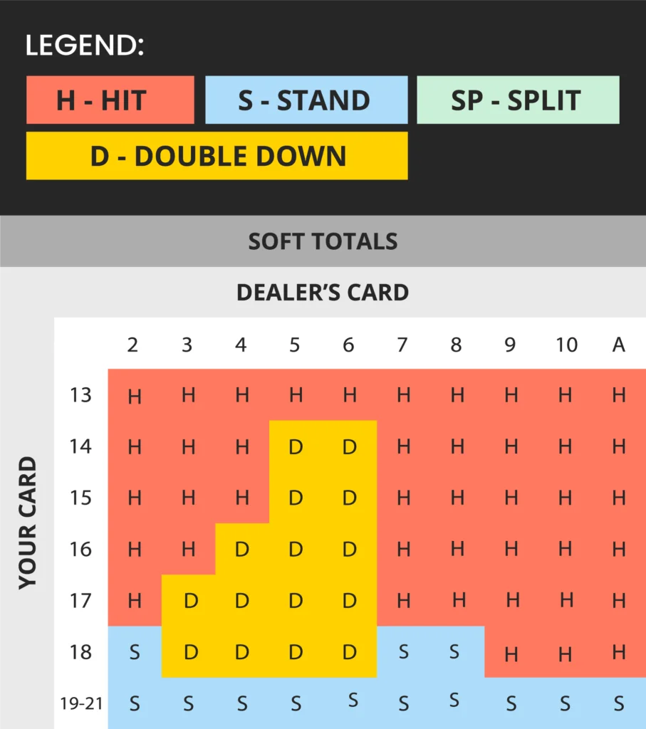 The letters S and H in front of the player's column are abbreviations for "Soft" hand (when the player has an Ace) and "Hard" hand (when there’s no Ace).