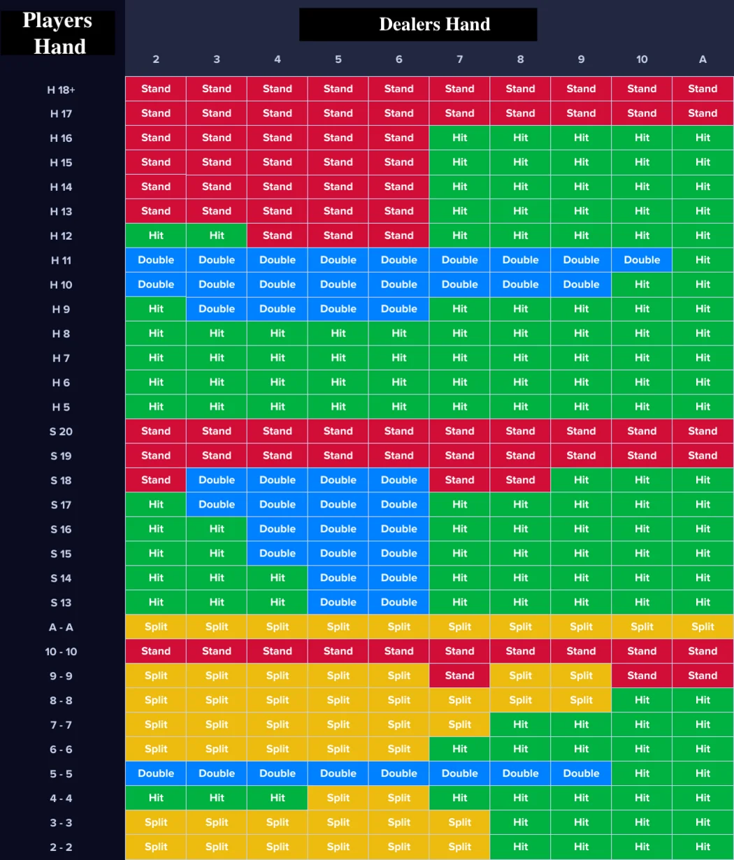 To achieve perfection, you need to start with the basics. Here the basic blackjack betting strategy system comes to help players. It is based on a mathematical algorithm that has been tested over years of use and a computer simulation program. Precisely following its instructions, you can achieve excellent results, reducing the casino's chances of winning to the minimum values.