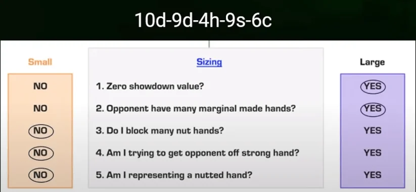 So we have arguments for both large bet sizes and small bet sizes. Now you need to logically weigh them and make a final decision on the size of the bet. Moreover, its choice does not have to be polar - you can bet half a pot if the weights of the arguments for and against are approximately similar.