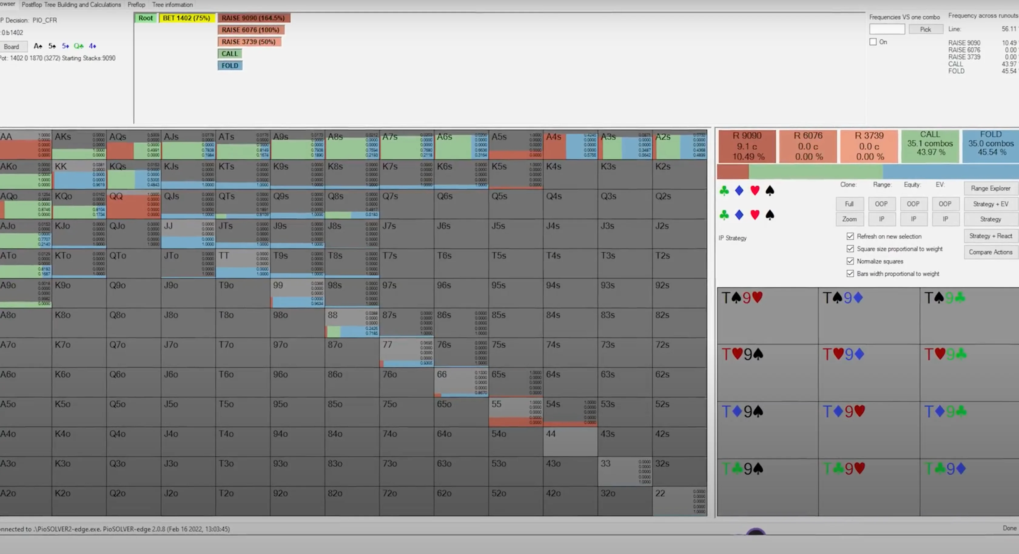 Hands like pocket kings, pocket queens, and king-queen went from being mixed strategy to being pure strategy raises. What happens is that now that the out-of-position player is under-bluffing, calling with hands has decreased in value, and raising became the highest payoff option.