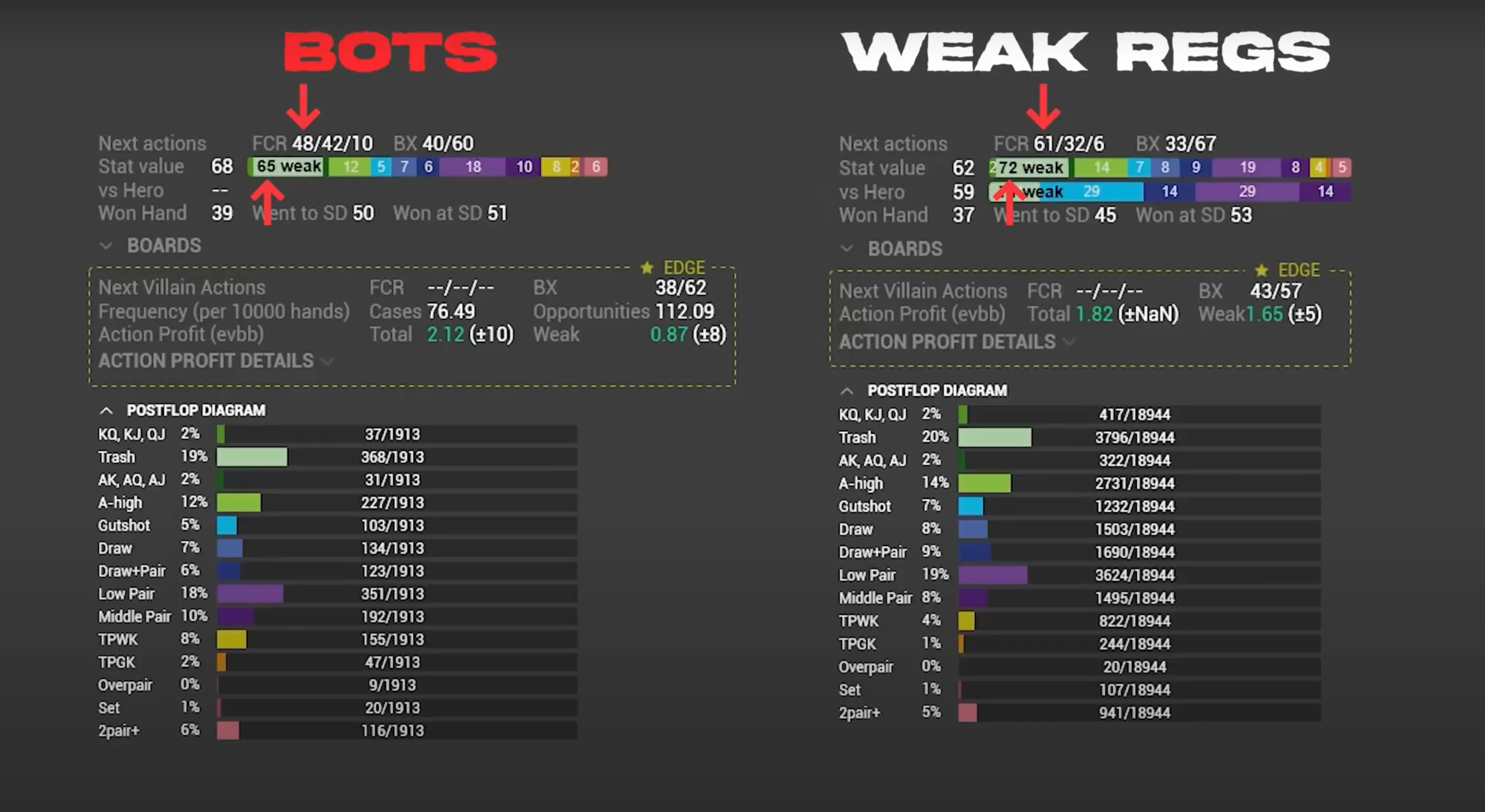 This is confirmed by data. When we look at the range composition of passive regulars when they check out of position on the turn as the caller, and compare it to the range composition of bots in the same circumstance. We observe that passive regulars have an excess of 7% of weak hands in their checking range, which causes them to fold 13% more than bots when facing bets.