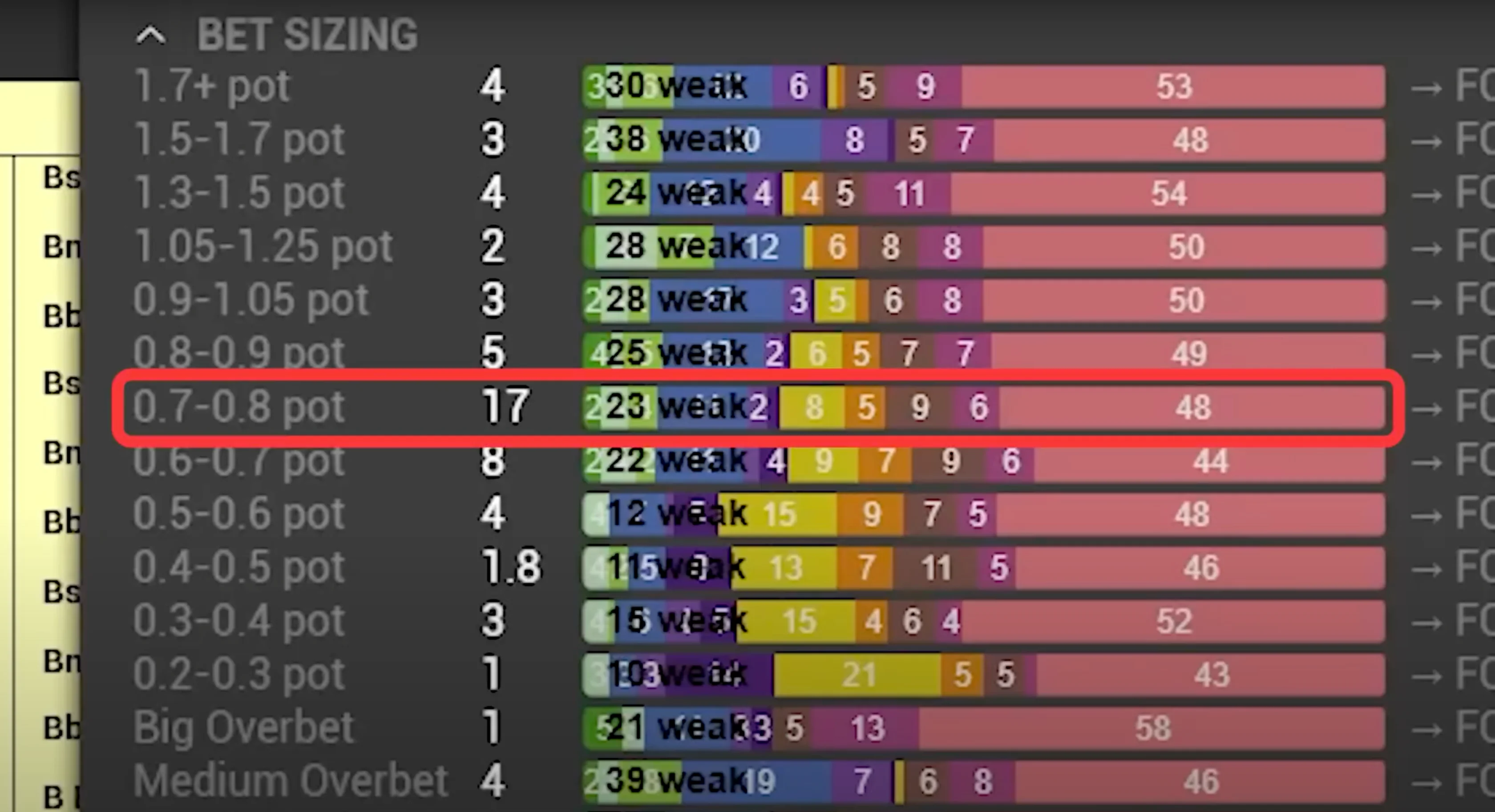 We can see that for the 75% bet sizing, they have, on average, only 23% of bluffs. When someone bets 75% pot into you, they're laying you pot odds of 30%, which means they need to be bluffing 30% of the time so that your bluff-catchers can break even on a call.