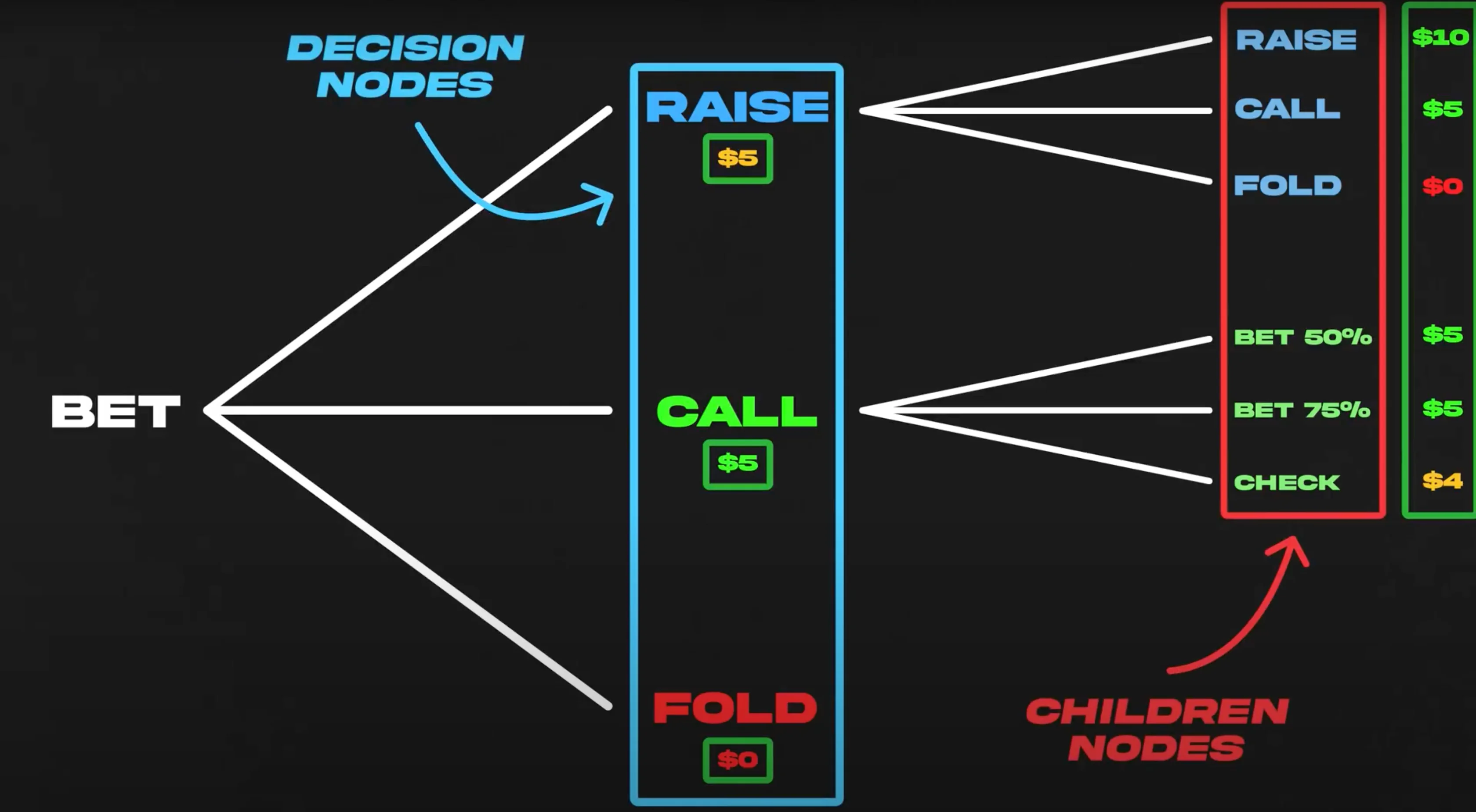 In the context of poker, a tree diagram represents all the possible decision nodes of the game and all their respective child nodes and their payoffs: