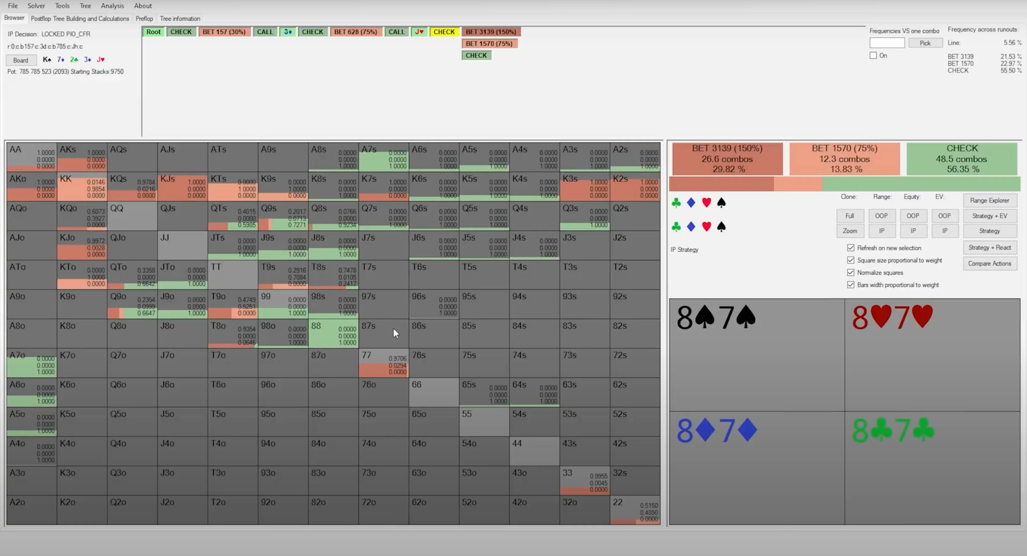 Everything else in the in-position player's strategy was kept exactly the same, including the optimal turn strategy, so that the solver wouldn't be able to take advantage of any misconstruction in range composition caused by the excess of passivity. The only variable change was how often the out-of-position player faced a turn bet.