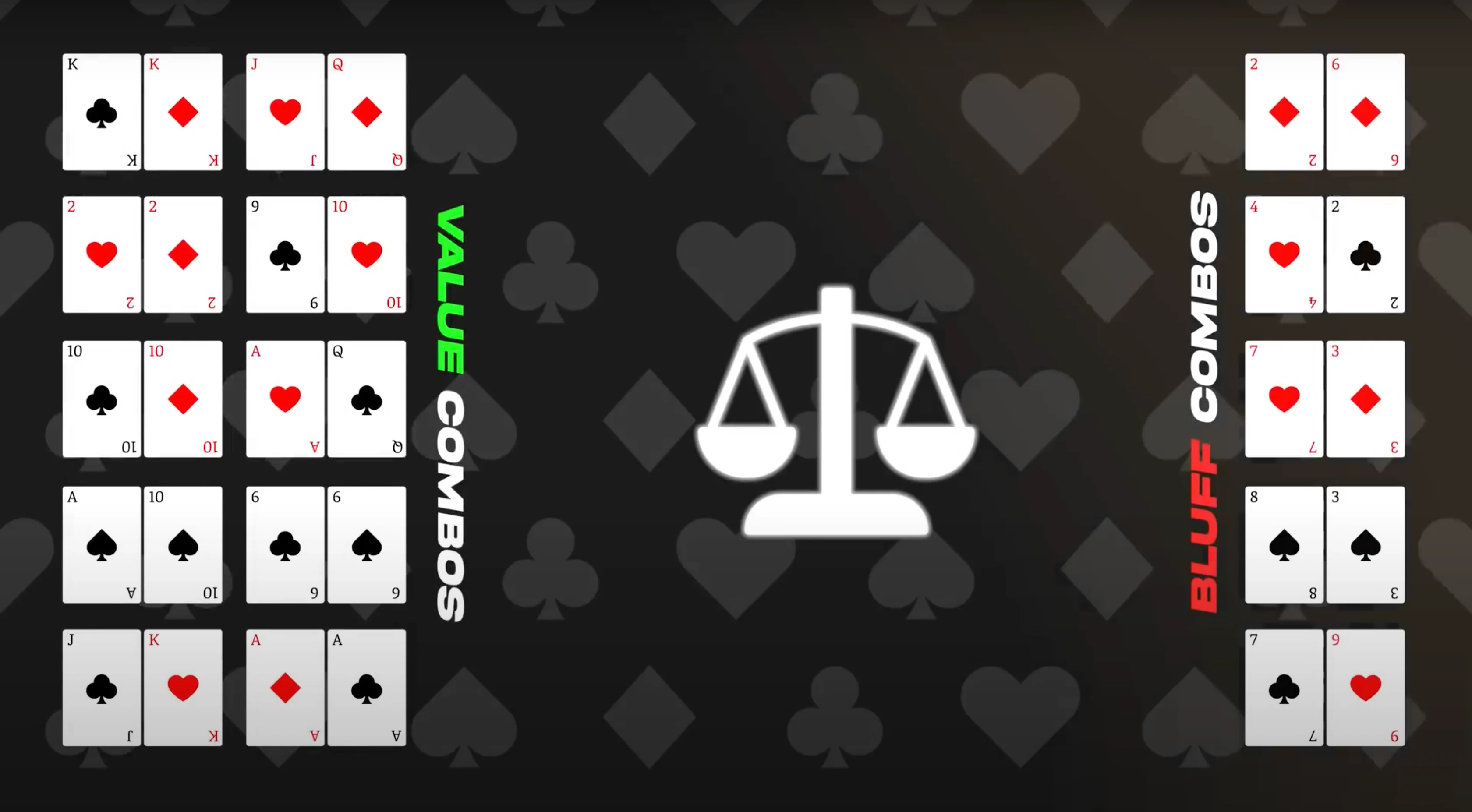 If you decide to bet for a pot size, for example, and you have 10 value combos, you need five combos of bluffs to be properly balanced. So, you go into the pool of your potential bluffs that you got to that particular scenario with and draw five combos to place into your betting range to make it balanced. The remaining bluffs go into your checking range.