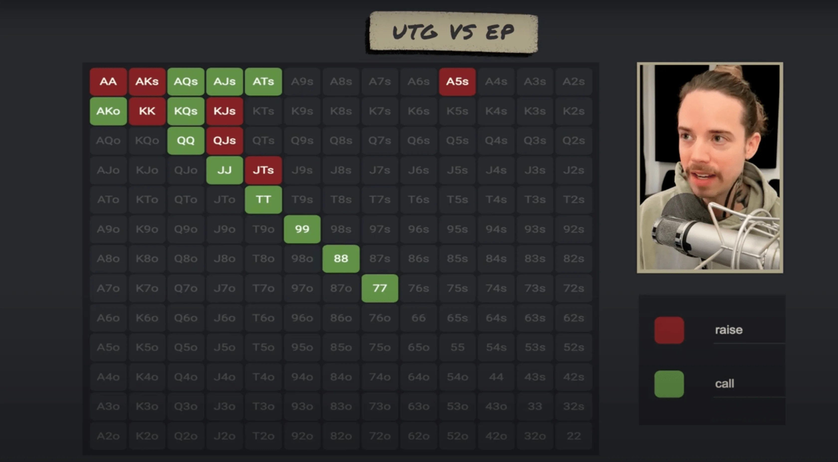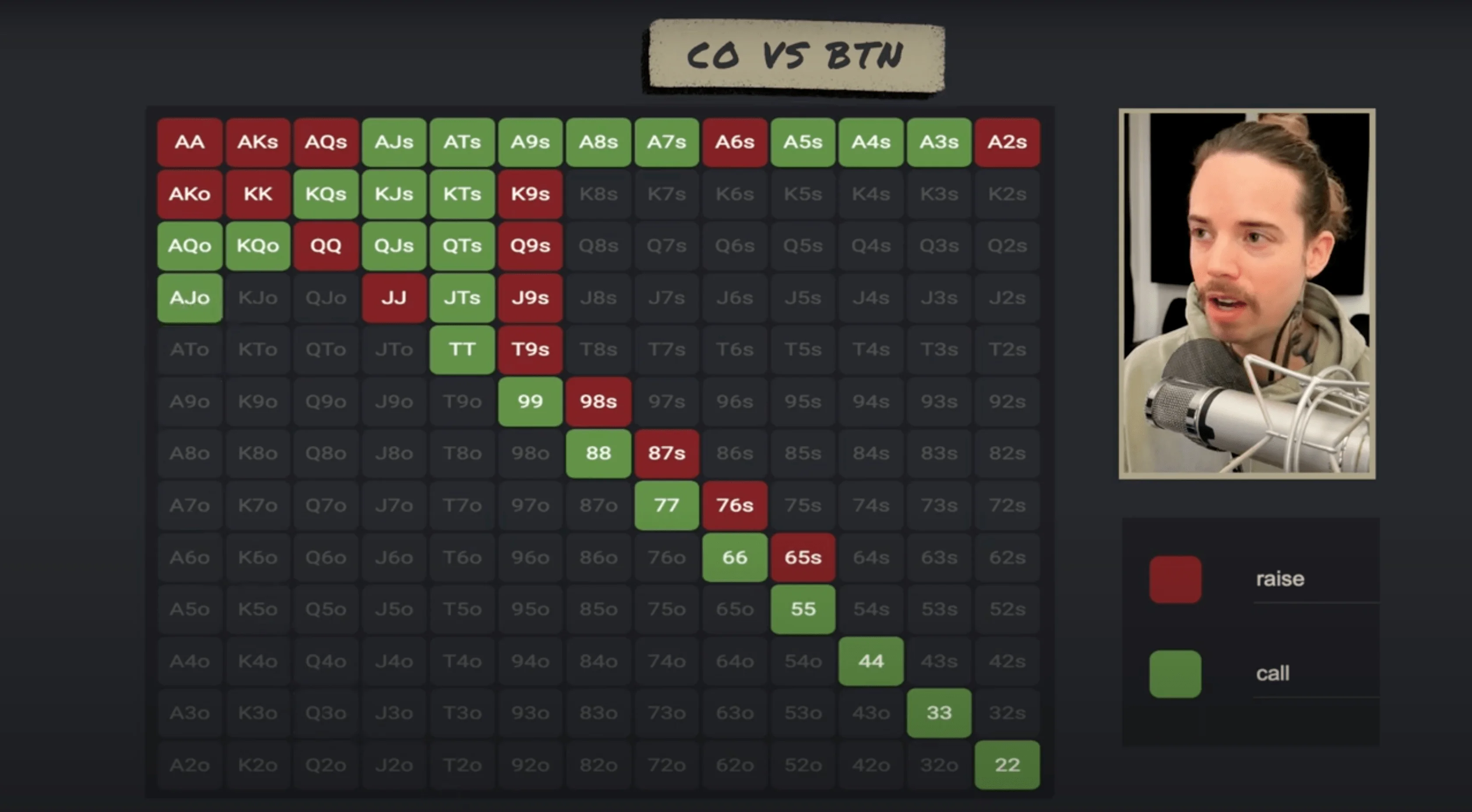 Remember to let the fish into the pot, and as you can see, the middle of our range shifts as we get to later positions. Now, all these pocket pairs can call, and we can obviously call much wider when the cutoff opens than when an under-the-gun player opens. Maybe these 9x hands would be worked in as three-bets as well. So again, the green hands are calling, and the red hands are three-betting. This is what a polar three-bet range looks like when a pro opens cutoff and we are on the button.