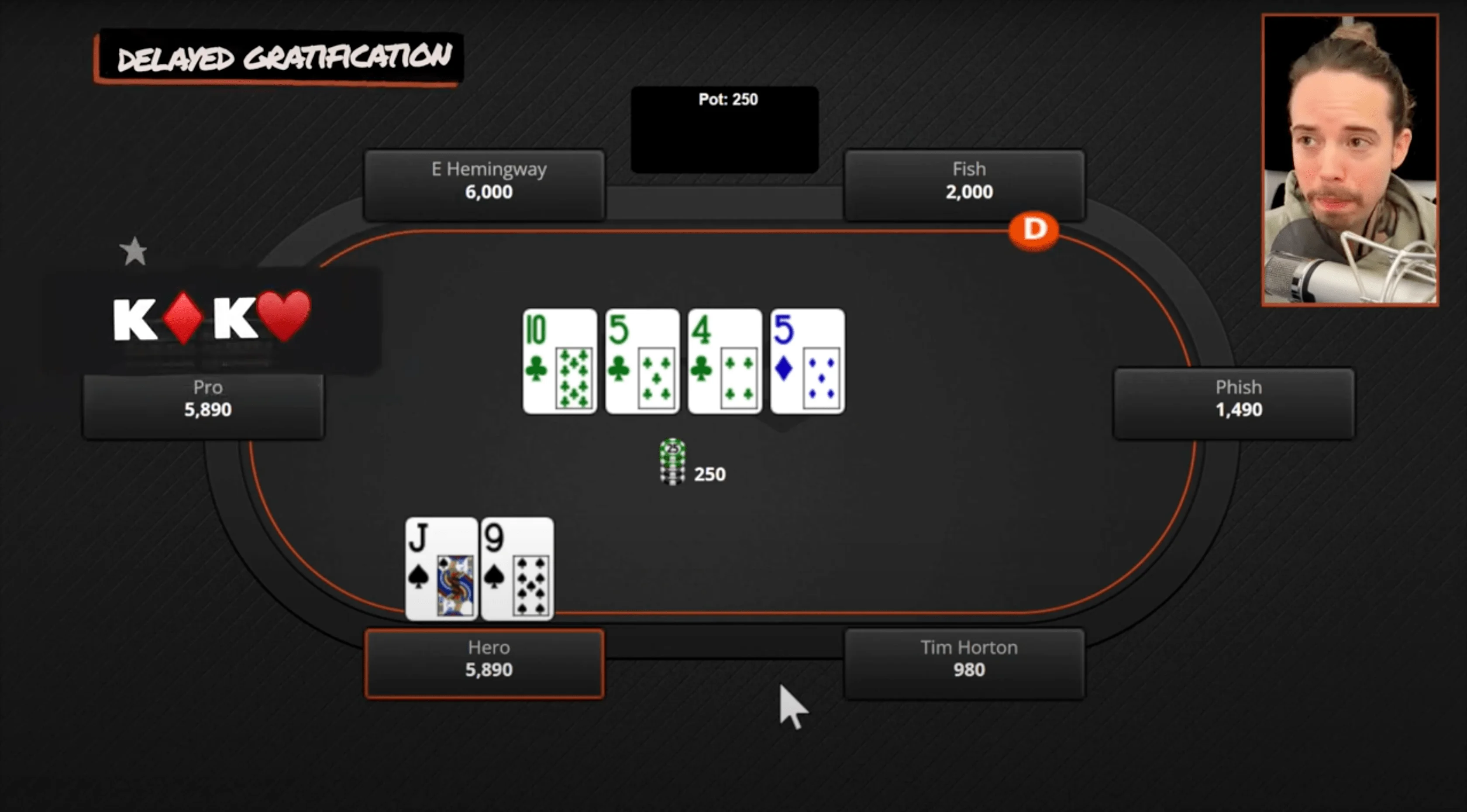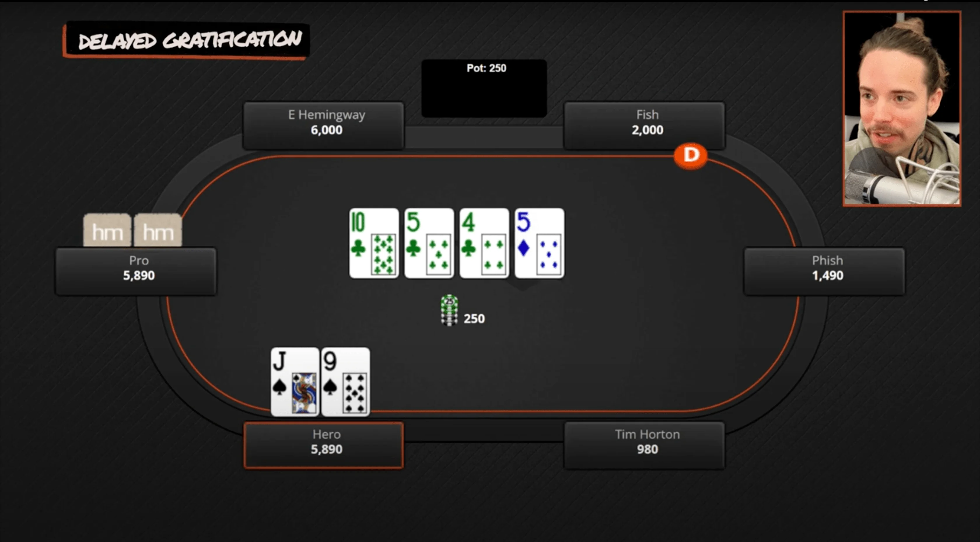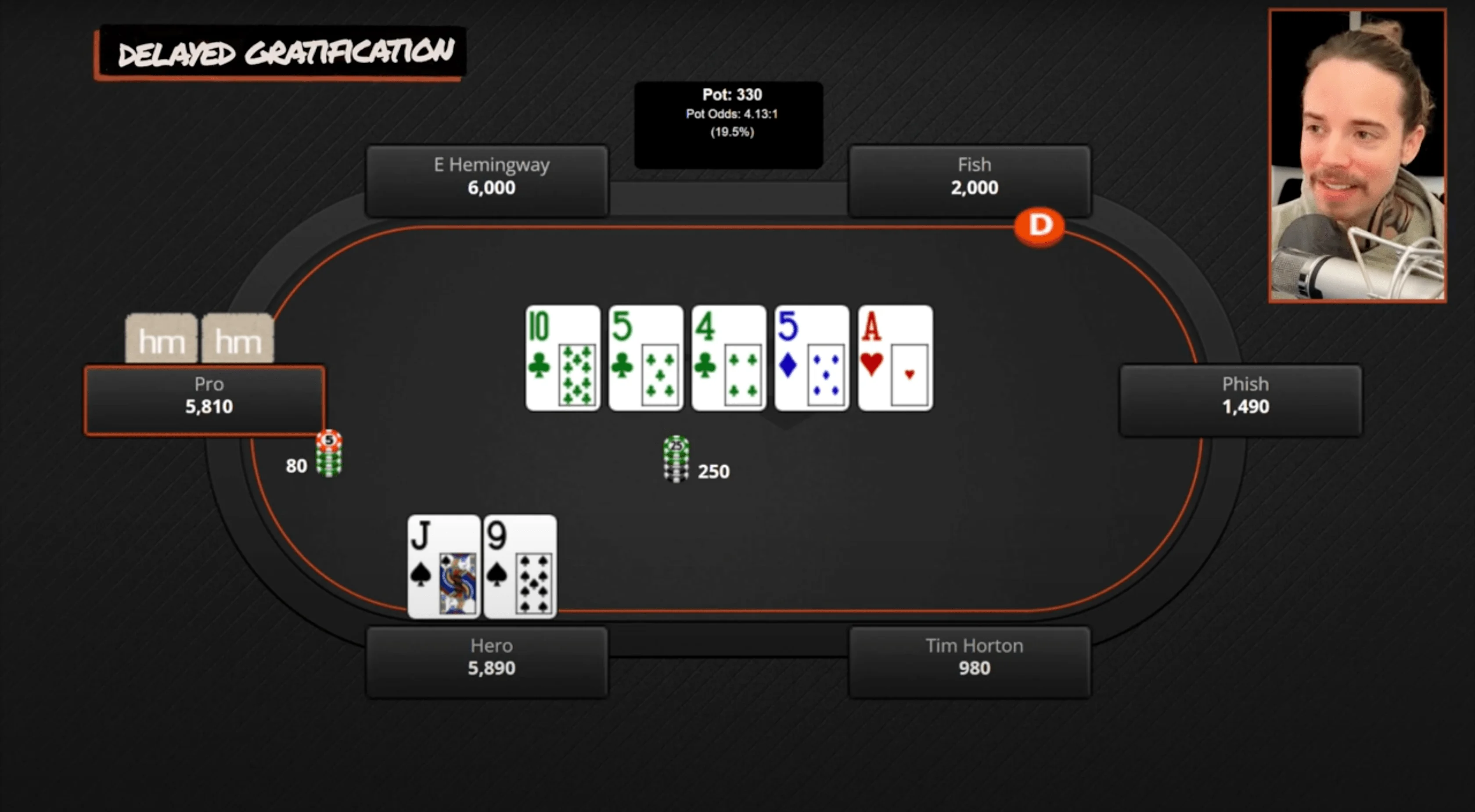 So, a pro opens from under the gun to $110. We're in the $40 blind with Jack-9 suited, and we decide to call. We go to a flop of 10-5-4, all clubs. We're pretty much done with this hand, right? If he c-bets on this flop, we're just folding — we have nothing going on. So we check, but he checks it back. We go to a turn, and now the turn is a five. We have complete air here, and most players' intuition in this spot with Jack-high would be to start a bluff. But in my opinion, that is not the best play.