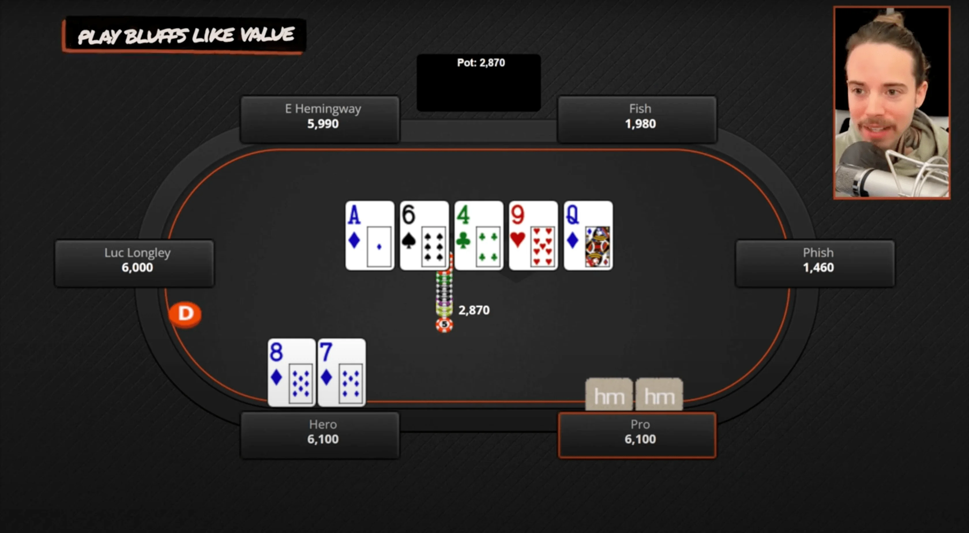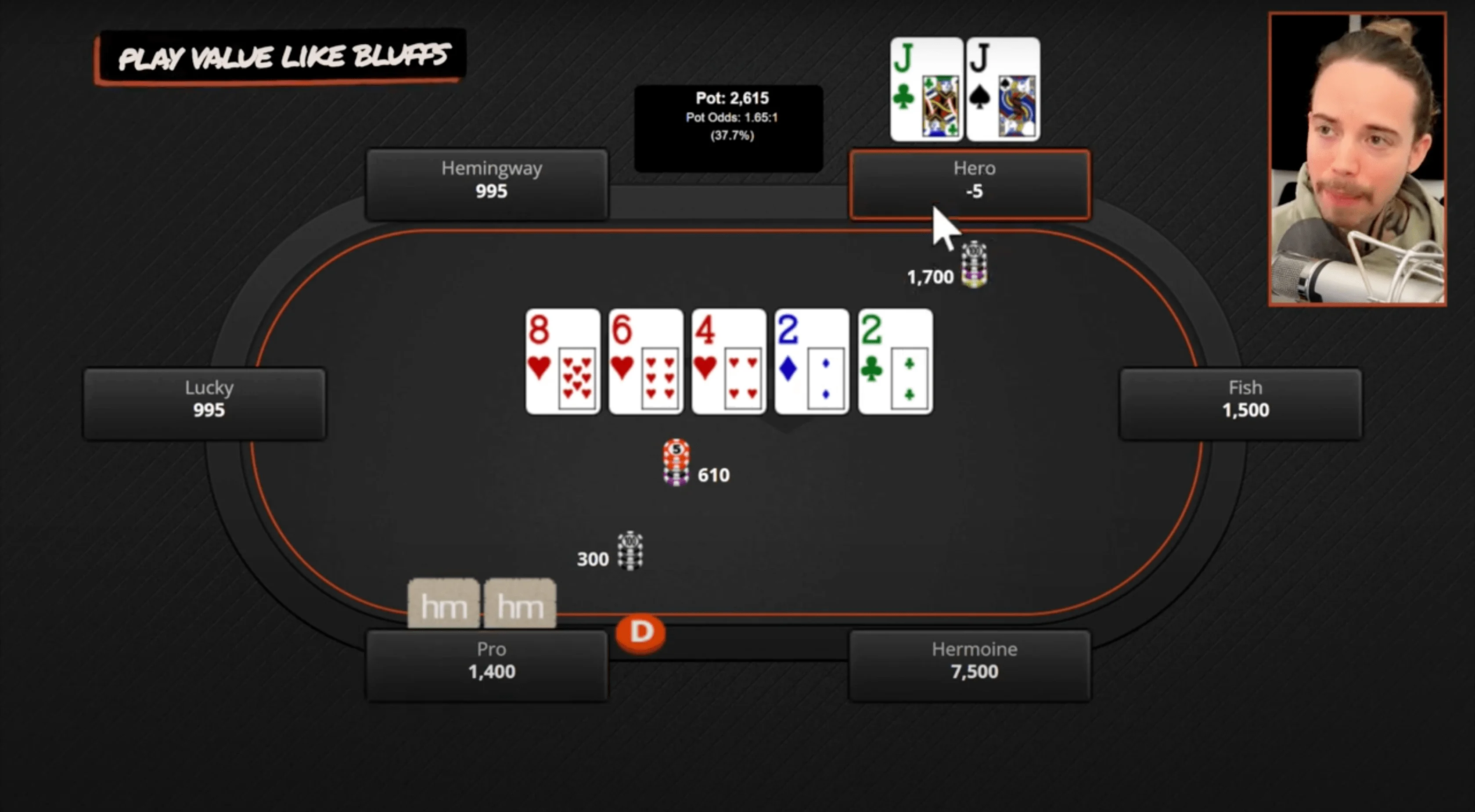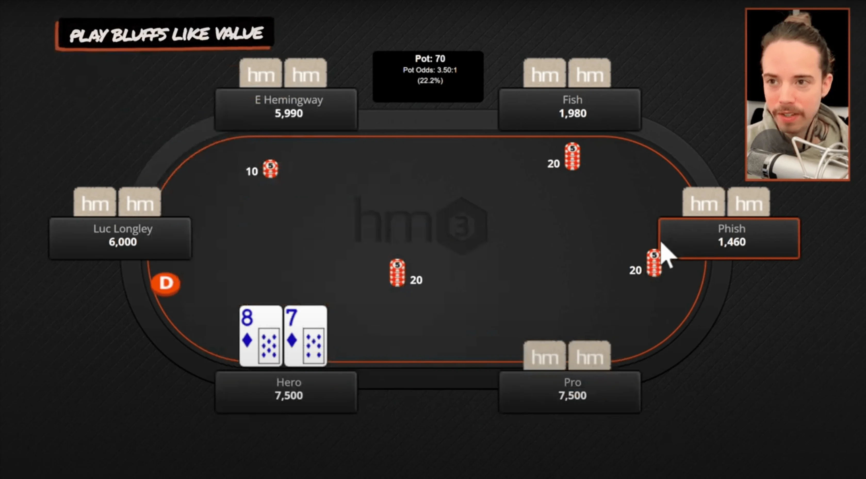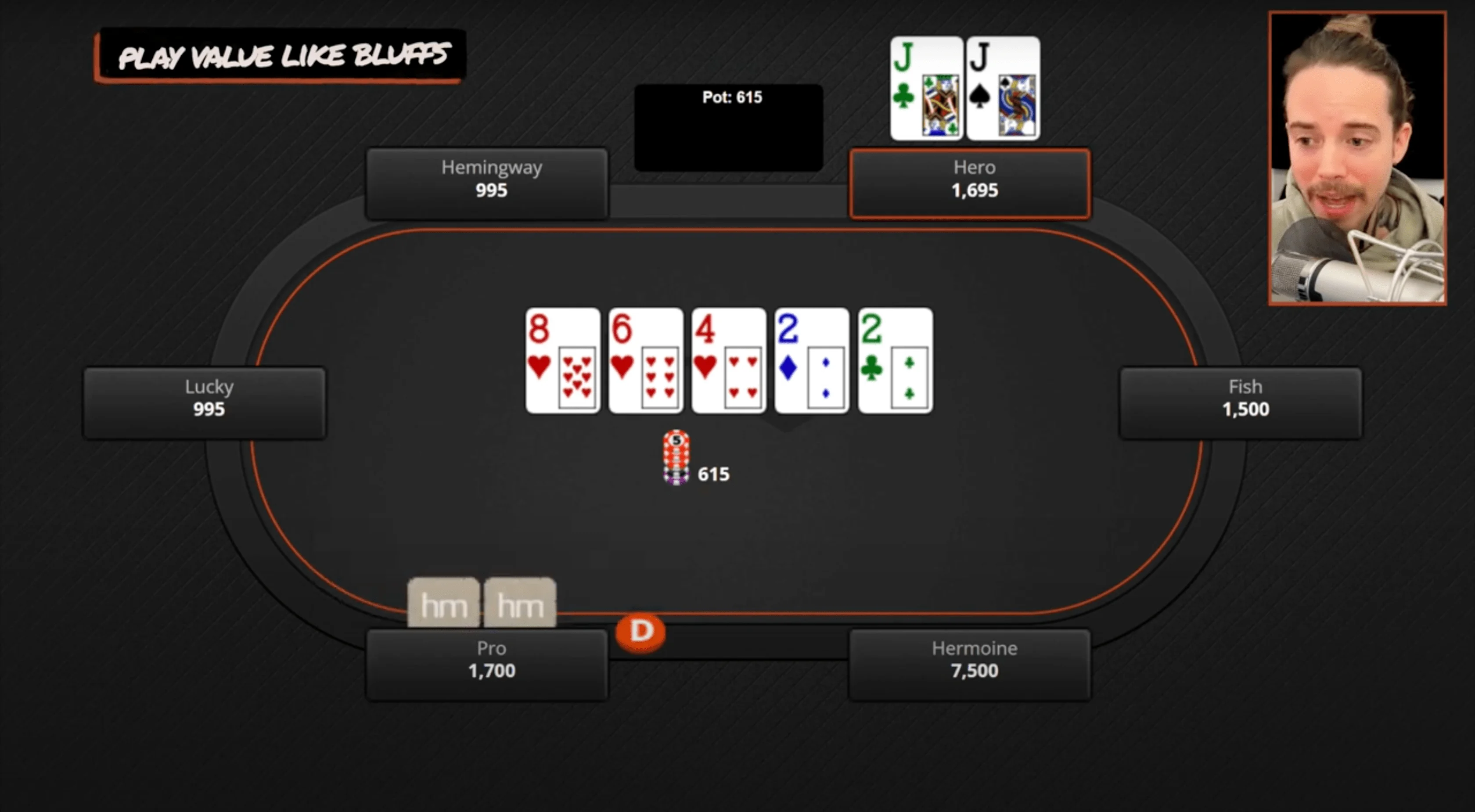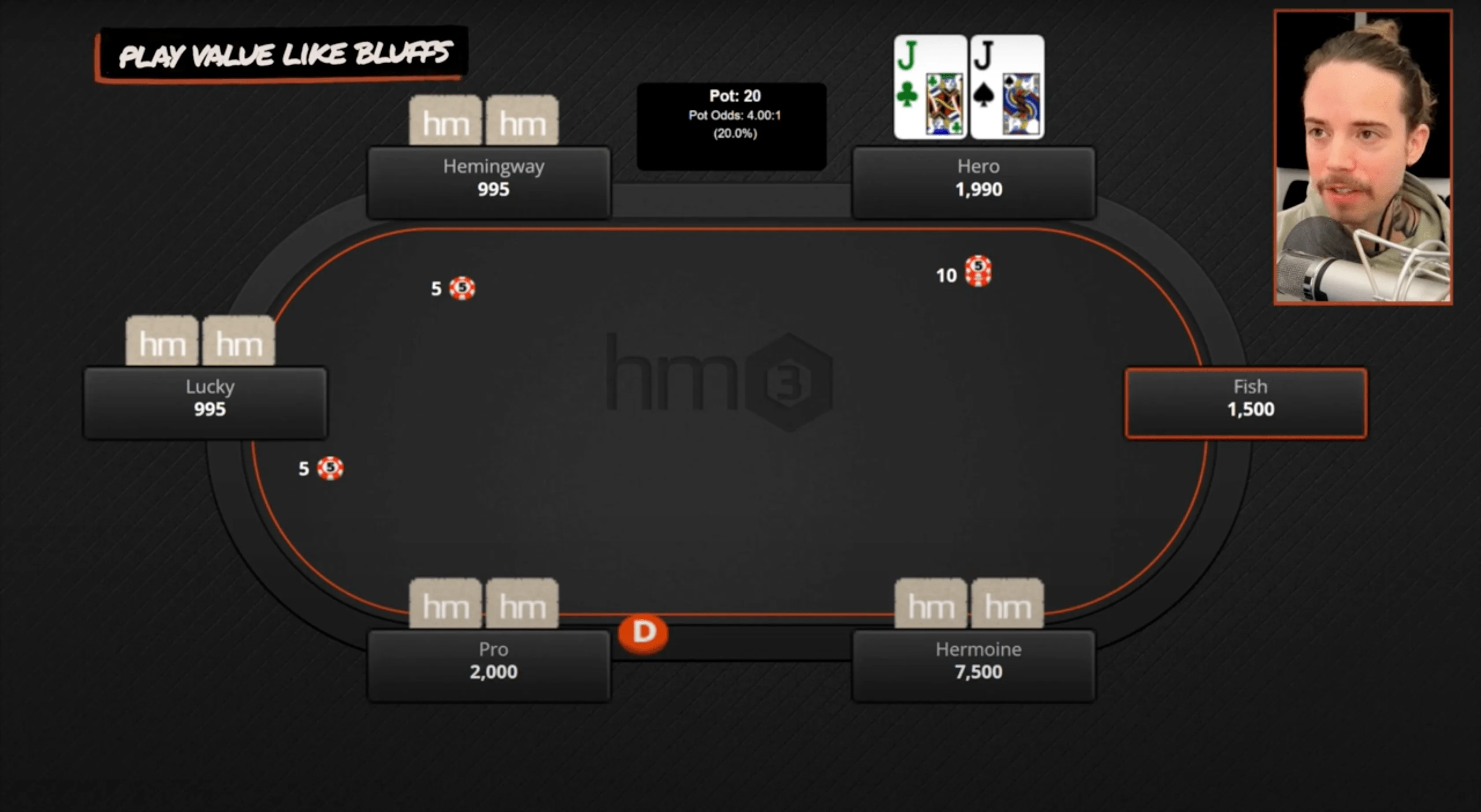 All right, next hand here, and this is one of my favorites because it illustrates a couple of concepts. Most importantly, it illustrates playing your bluffs like they would play value.