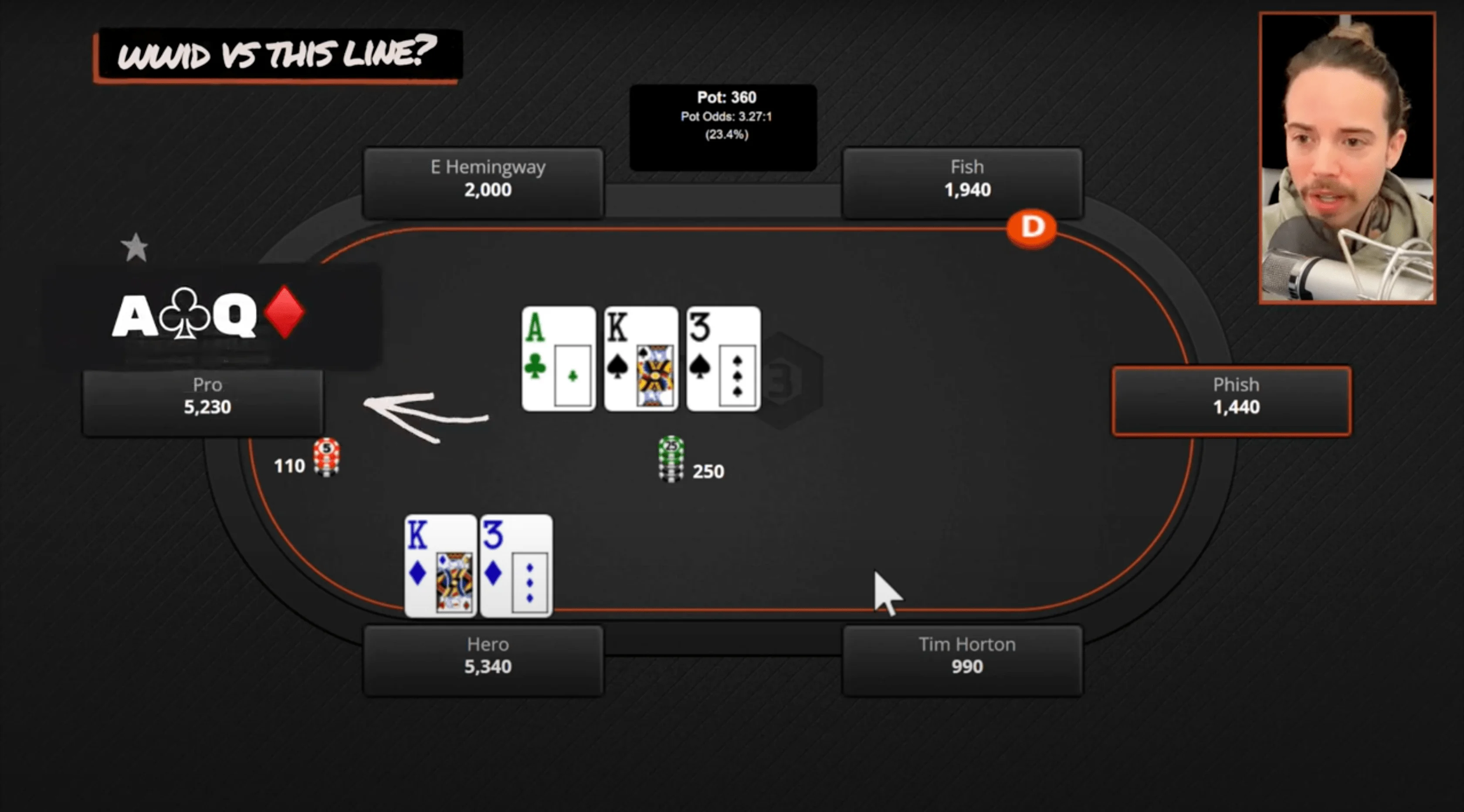 So again, what would I do versus this line? If we're the pro and get check-raised with a hand like Ace-Queen or Ace-Jack, we're probably calling once and folding the turn. If we get called when we c-bet the flop as the pro, we're probably going to continue barreling for value and continue bluffing.