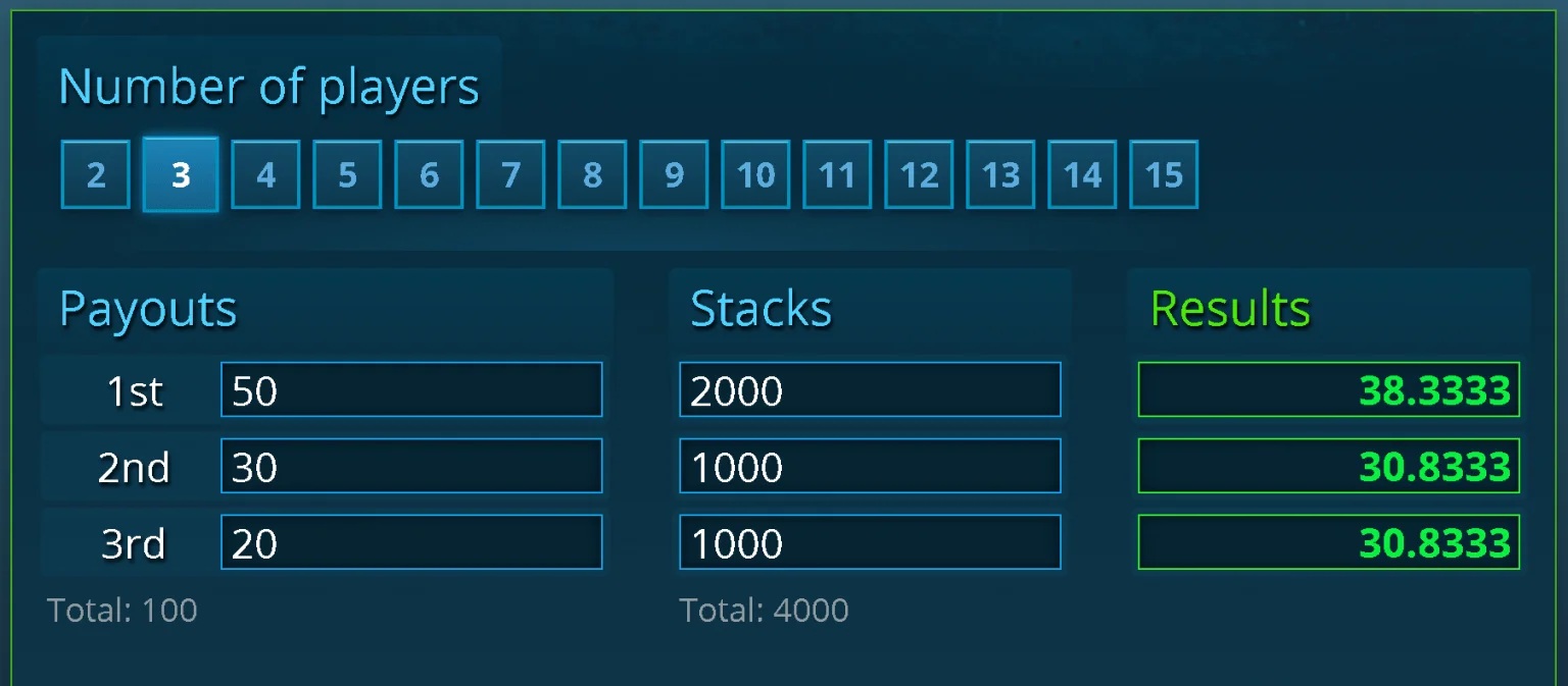 ICM can be calculated using tools like ICM Calculator, which can handle 2 to 15 players by setting the payout structure and chip amounts.