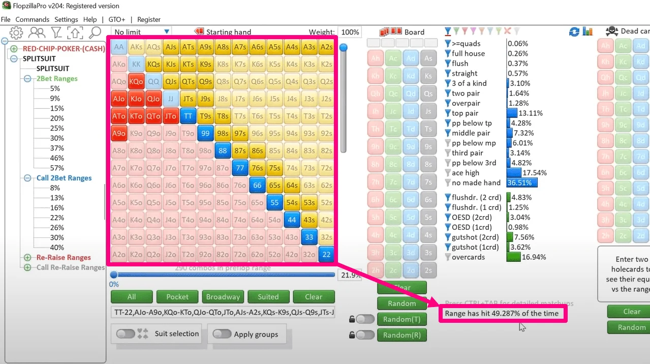 To learn to understand how different ranges hit and miss flops/turns/rivers, you can use different tools. But I consider FlopzillaPro to be the best - the most advanced poker calculator to date, which has a very convenient and demonstrative interface, simple operation for the user, and is also able to connect to the GTO+ solver for simultaneous work in both of these programs.