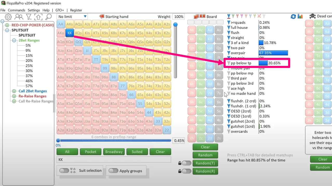 But let's move on to how FlopzillaPro helps you understand the hit (and miss) frequencies of different hands and even entire ranges. For example, let's see how the strongest unpaired starting hand (AK) hits the flop.