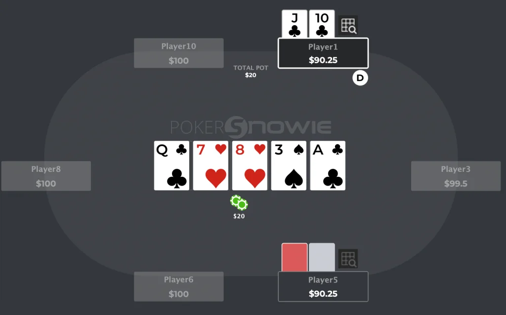 - Current Hand: T♣9♣ is weak with no potential to win the hand if called.