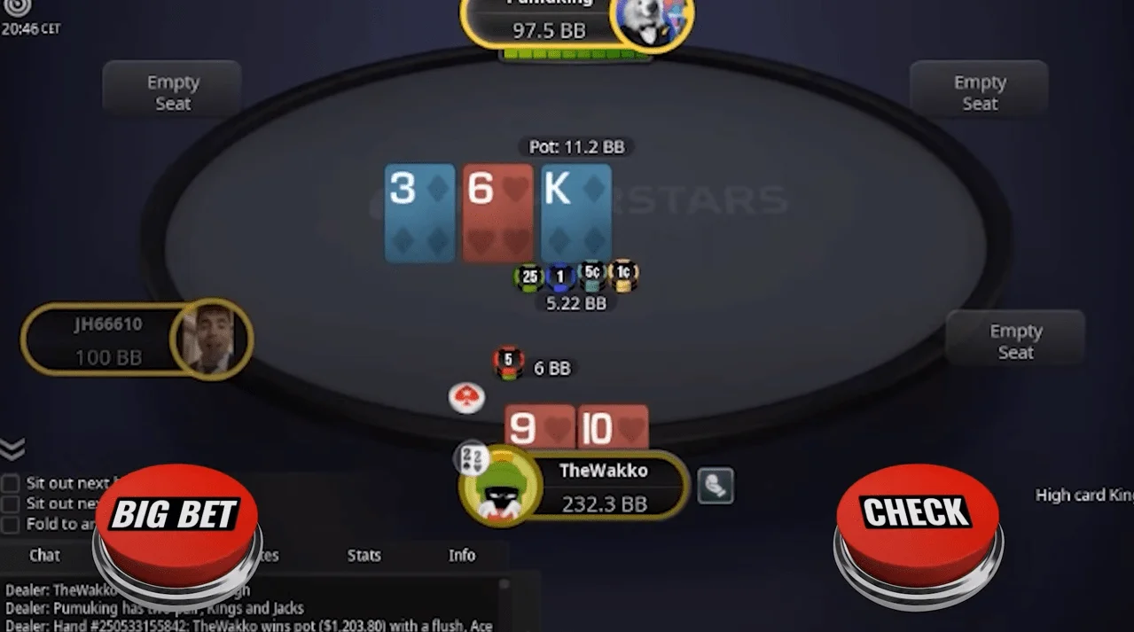 Instead, I will immediately exclude c-bets for 1/3 of the pot in this spot and will either bet big or check-back. Entire poker is exploit.