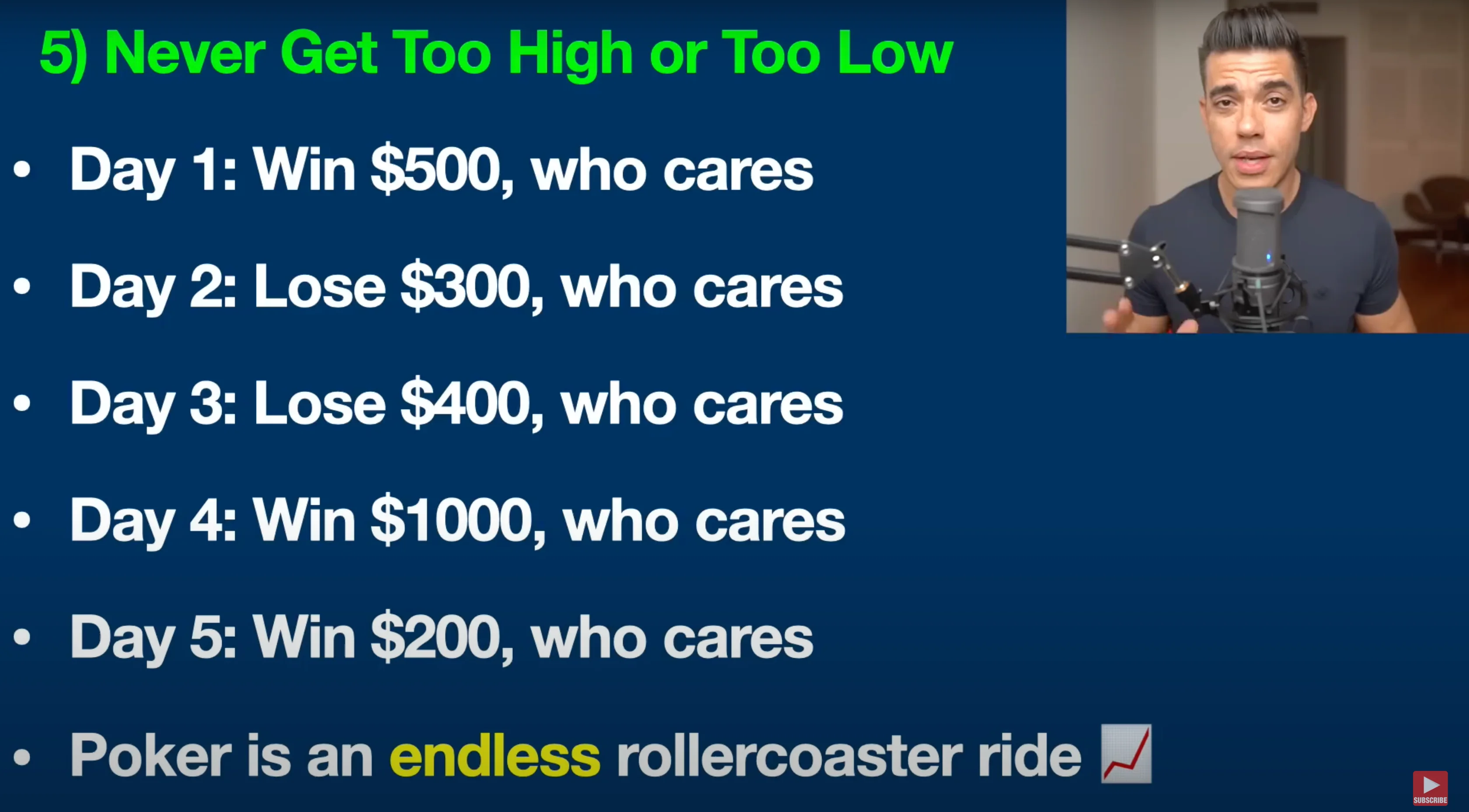 Alright, let's move on to sign number five that you're up against a poker pro: they never get too high or too low.