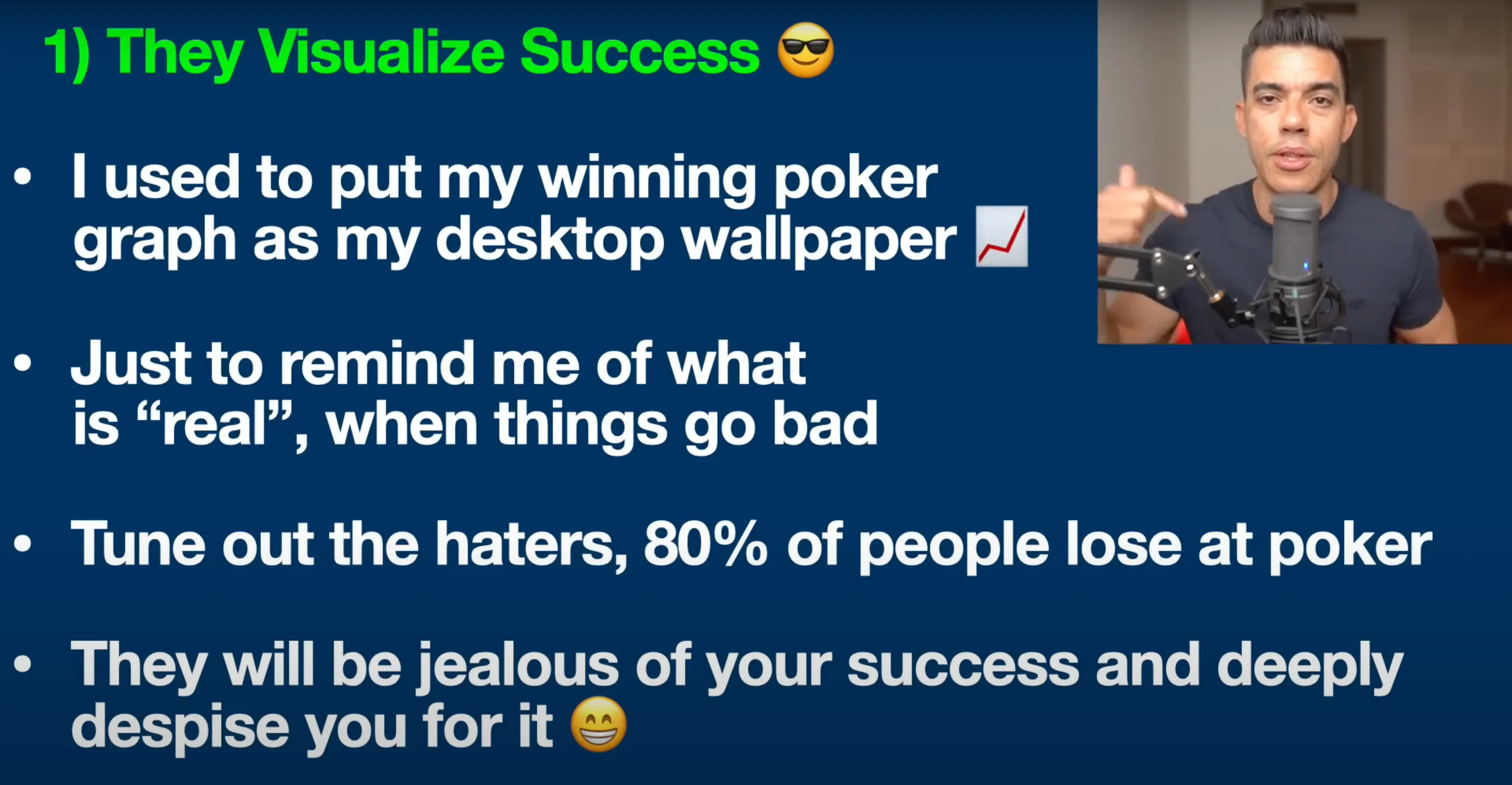 Alright, let's move on to the number one sign that you're facing a poker pro: they visualize their success. I used to do this quite literally. I would put my winning poker graph, which you can get from a Heads-Up Display (HUD) program (I'll link the one I use in the description below), and I would visualize my success.