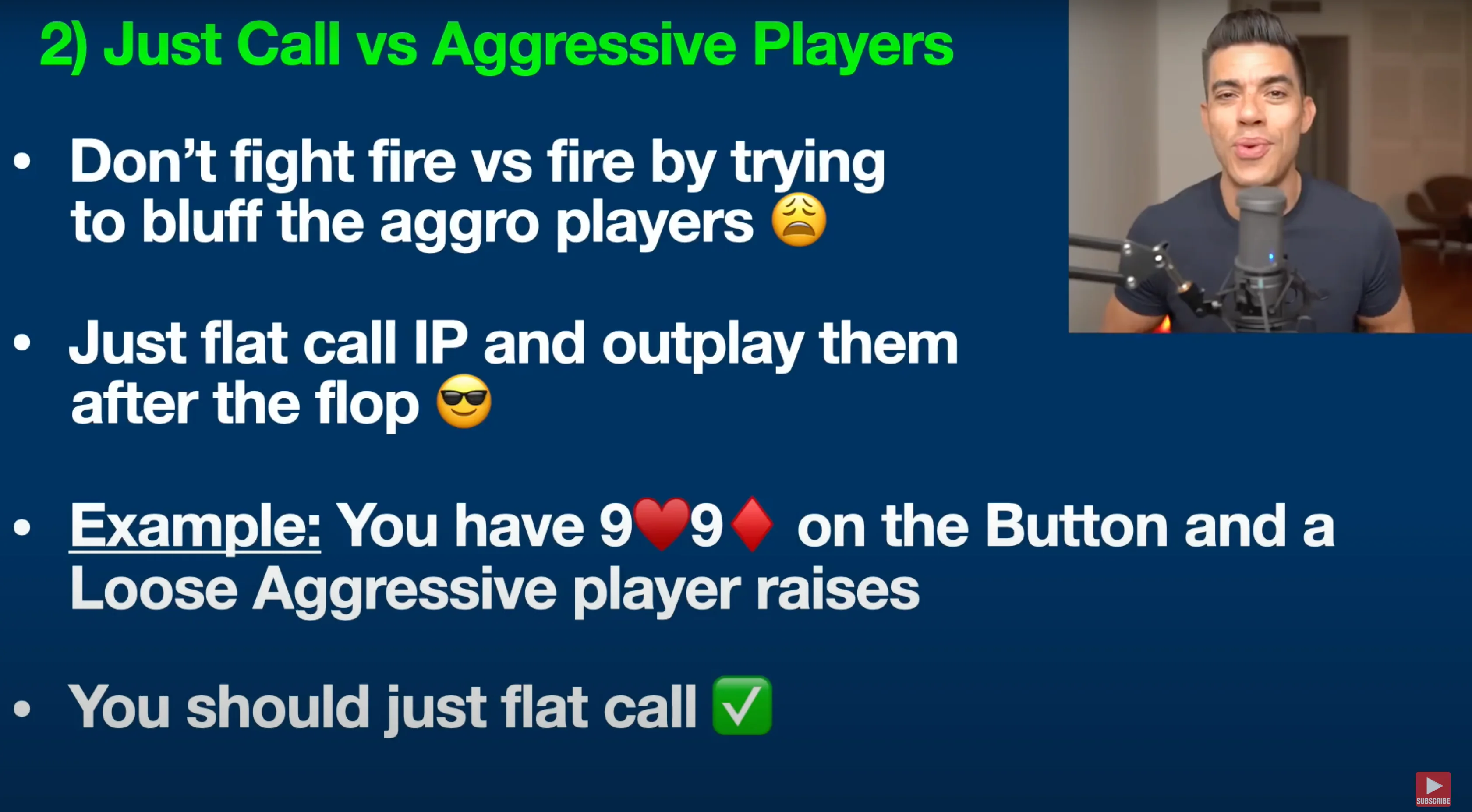 For example, let's say you have two red nines on the button and a loose, aggressive player raises. What should you do? Just flat call. If you go for the three-bet in this spot, it opens the door for them to re-raise and put you in a tough situation where you're risking a lot of your chips with a good but still mediocre hand like pocket nines.