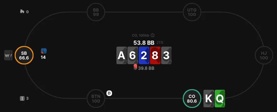 Imagine you hold K♠Q♣️ in the CO. On the river, your opponent bets 14bb (35% pot size). In this case, considering blockers makes a bluff more viable.