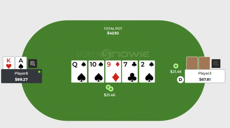 Here, Player 8 on the left holds A♠K♥. Holding the A♠ means the opponent cannot have the A♠ and thus cannot make an A-high flush.