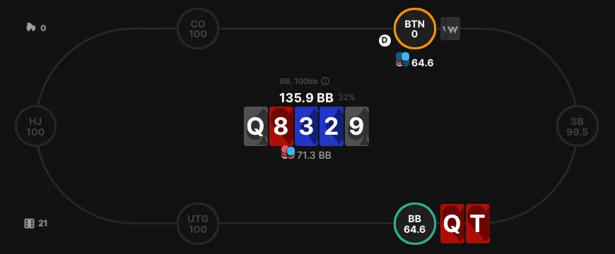 Imagine you hold Q♥T♥ in the BB. Your opponent goes all-in for 64.6 bb (91% pot size) on the board: