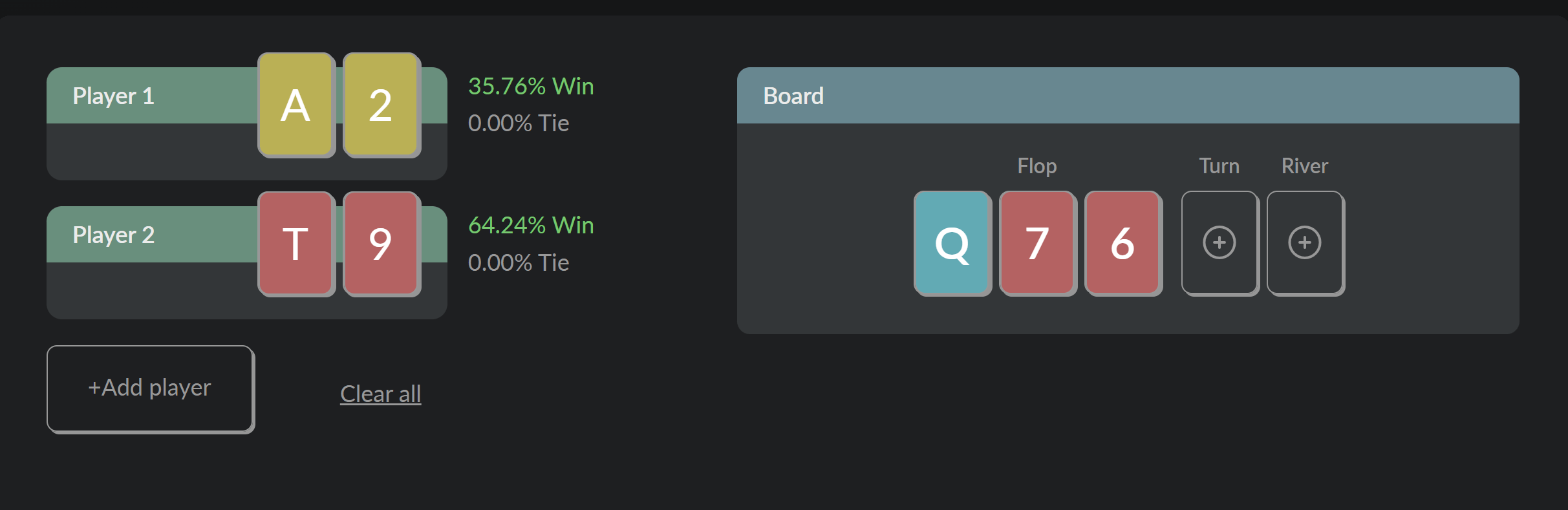 To use the calculator, set a hole cards of the players and you'll immediately see their chances to win the hand. You can add more players (up to 10) and set community cards (Flop, Turn, and River). So you can calculate the odds of winning for any hand on any street from Pre-Flop to River. Our calculator will show you the winning chances for every hand depending on the parameters you set.