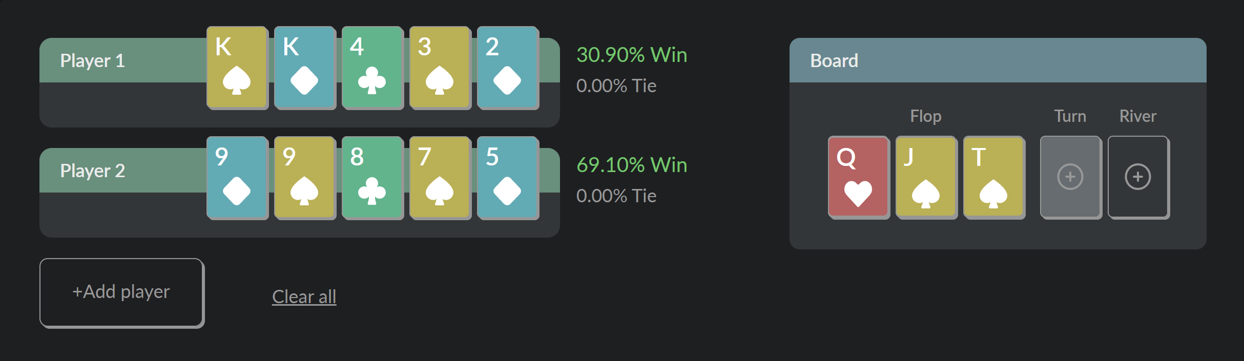 The calculator shows the winning odds (equity) for each hand at any point in the game. Simply input the required information, and it will calculate the equity for all players.