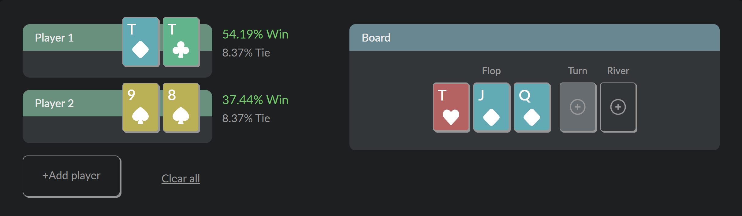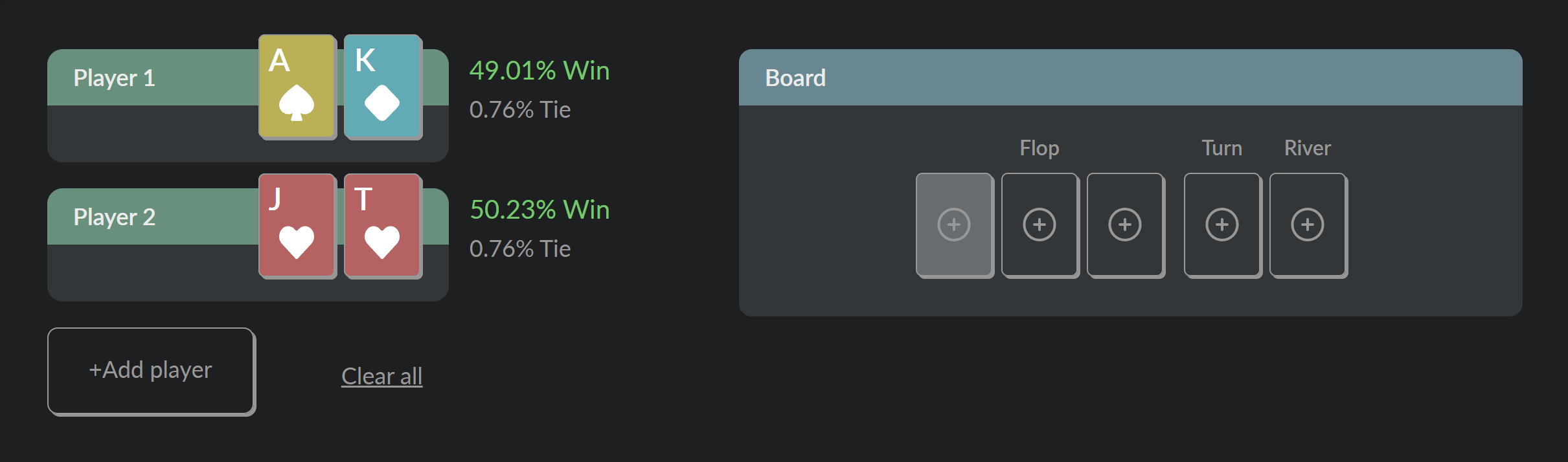 6+ Holdem Odds Calculator is a tool that allows you to quickly calculate the winning chances of specific poker hands against each other in the Short Deck Holdem game type. Set hole cards for two players and you'll instantly see their odds to win. It's also possible to add more players. So you can easily calculate the equity of all hands in a multi-way pot. If you set the community cards, the calculator will show you the odds on a specific street.